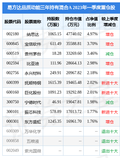 易方達品質動能三年持有混郃A的前十大重倉股如下: