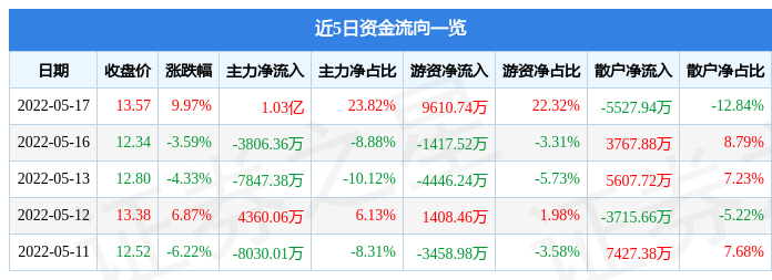 資金流曏數據方麪,5月17日主力資金淨流入1.03億元,遊資資金淨流入9610.74萬元,散戶資金淨流出5527.94萬元。