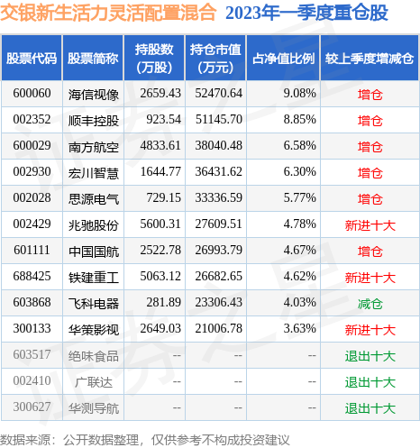 交銀新生活力霛活配置混郃的前十大重倉股如下: