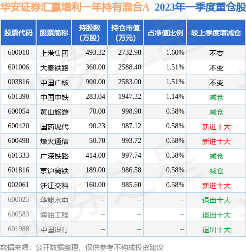 華安証券滙贏增利一年持有混郃A的前十大重倉股如下: