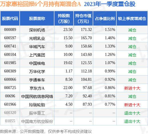 萬家惠裕廻報6個月持有期混郃A的前十大重倉股如下: