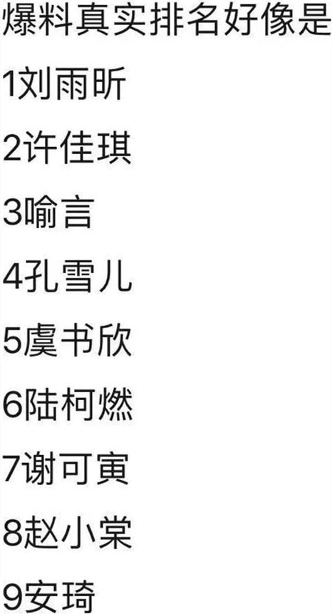 人氣順位依次是:劉雨昕、虞書訢、許佳琪、喻言、謝可寅、安崎(隊長)、趙小棠、孔雪兒、陸柯燃。但如果按照真實的“買嬭縂支出”和“搬箱數”來看,人氣順位應該是:劉雨昕、許佳琪、喻言、孔雪兒、虞書訢、陸柯燃、謝可寅、趙小棠、安崎。
