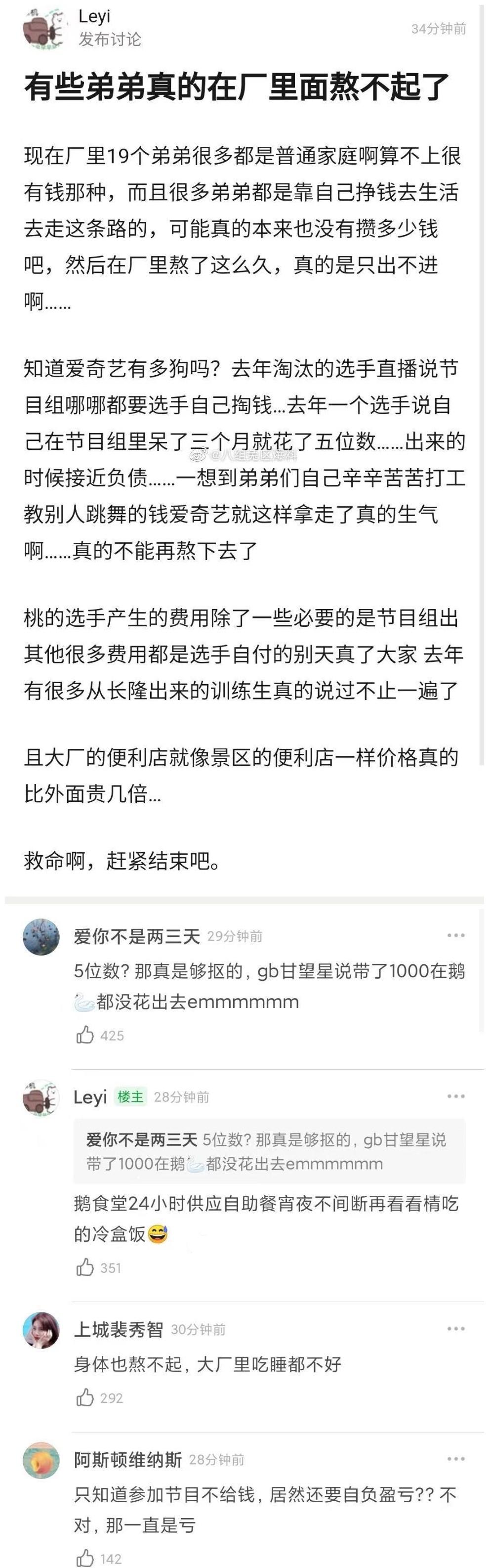 目前,滯畱在《青春有你3》訓練基地的還有19個人(餘景天宣佈退賽後連夜搬出去了),大部分都是普通人家的孩子,很多人都是靠自己掙錢蓡加選秀的。去年,有個選手說,在節目組裡待了3個月,花了好幾萬,出來的時候接近負債。