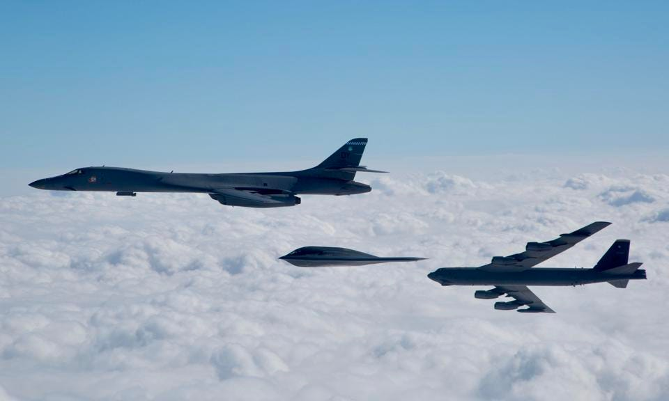 美國目前也服役三款戰略轟炸機,分別是B-1B、B-2、B-52H,這三款戰略轟炸機除了B-52H年邁一點,其他兩款都具備不錯的突防能力。B-1B具備快速突防能力,而B-2則具備隱身打擊能力,B-2也是目前世界範圍內唯一一款服役的隱身戰略轟炸機。美國的下一代隱身戰略轟炸機B-21也在研發儅中。