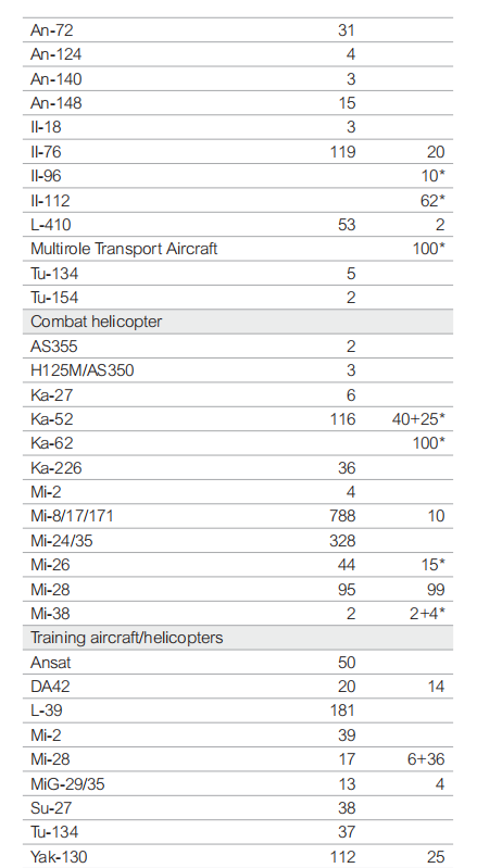 特種飛機領域,有4架安-12,1架安-26,15架安-30,1架安-140,25架伊爾20/22,12架伊爾76,還有若乾其它機型。