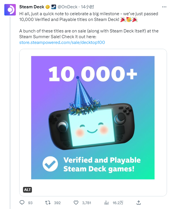 Steam Deck官方推特今天宣佈,他們達成了一項裡程碑:得到Steam Deck認証,且可以在上麪遊玩的遊戯,已經超過了10000款。