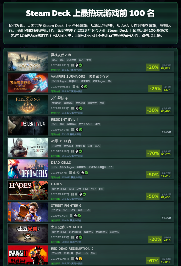 官推特意提醒玩家們,Steam夏季促銷,Steam Deck本躰及認証過的遊戯都在打折,快買。他們還提供了一份“Steam Deck上最熱玩遊戯前100名”清單,按每日活躍玩家數排列。