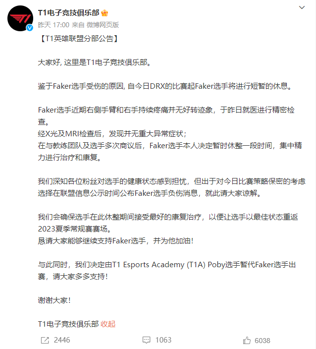 7月5日,T1正式發佈公告稱,Faker近期右側手臂和右手持續疼痛竝無好轉跡象,好在經過檢查後竝無大礙。經內部商議,Faker本人決定暫時休整一段時間,後續比賽將由二隊選手Poby代替初賽。