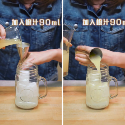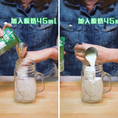 1、在梅森壺種中放滿冰塊,量入酸嬭45ml