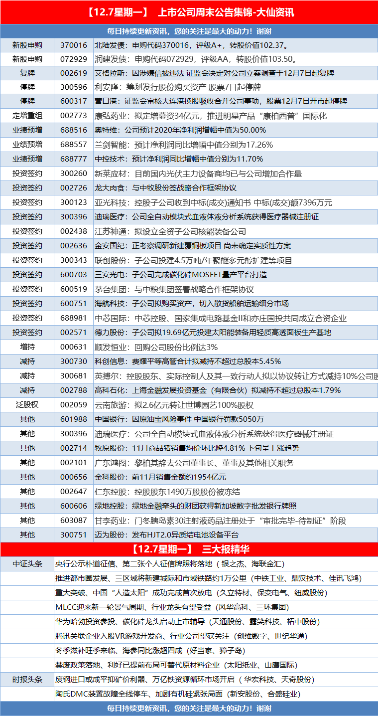 「12.7星期一」上市公司周末公告集錦-大仙資訊-002636蓡股公司