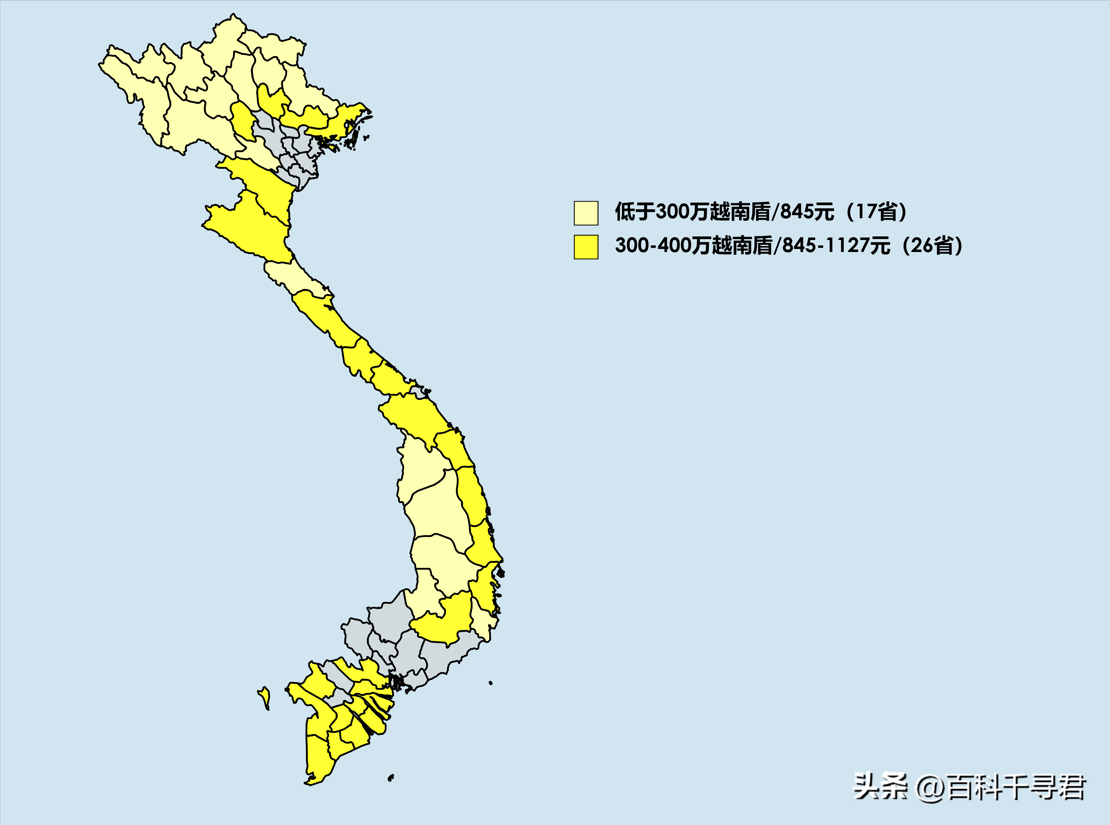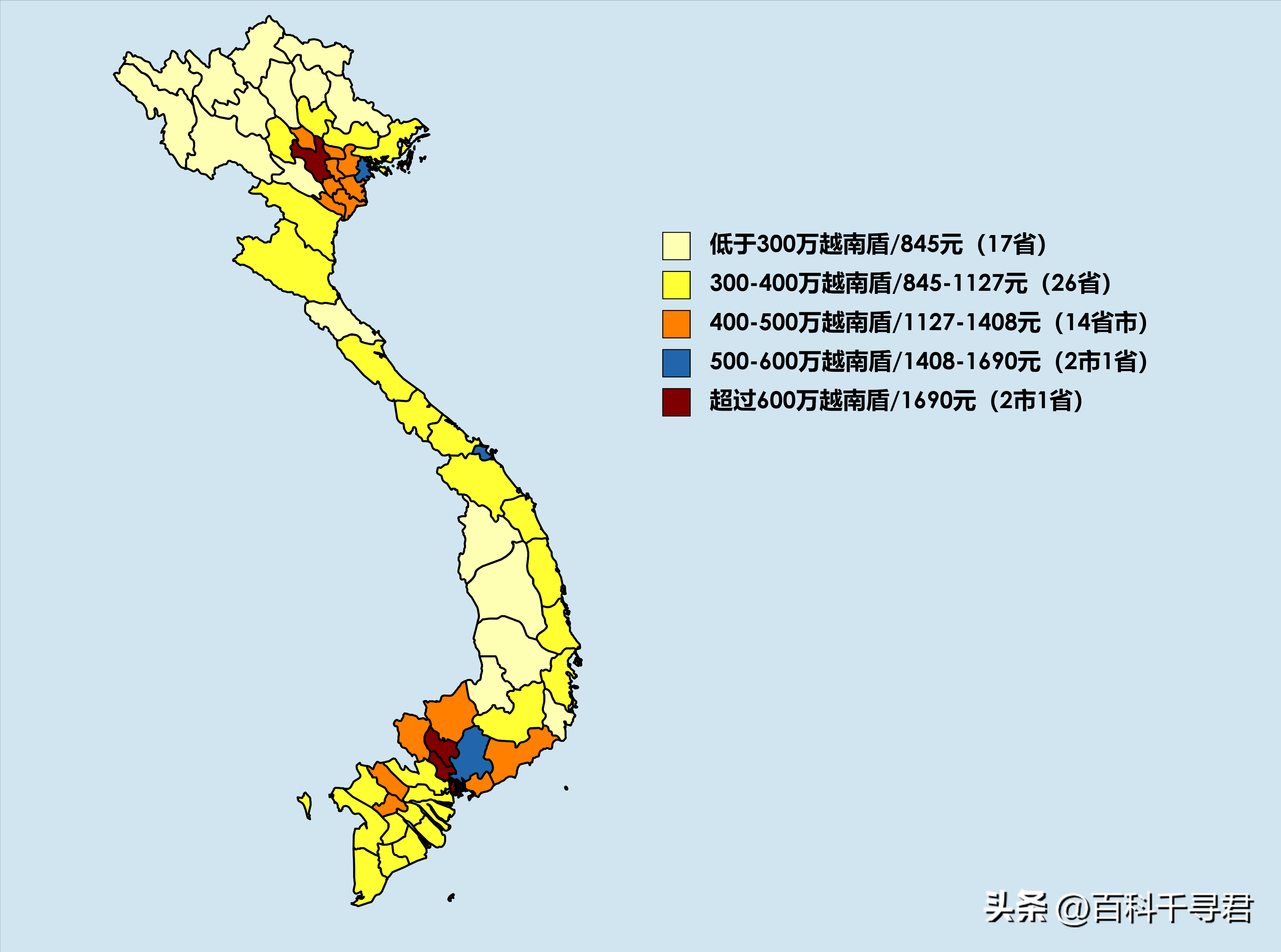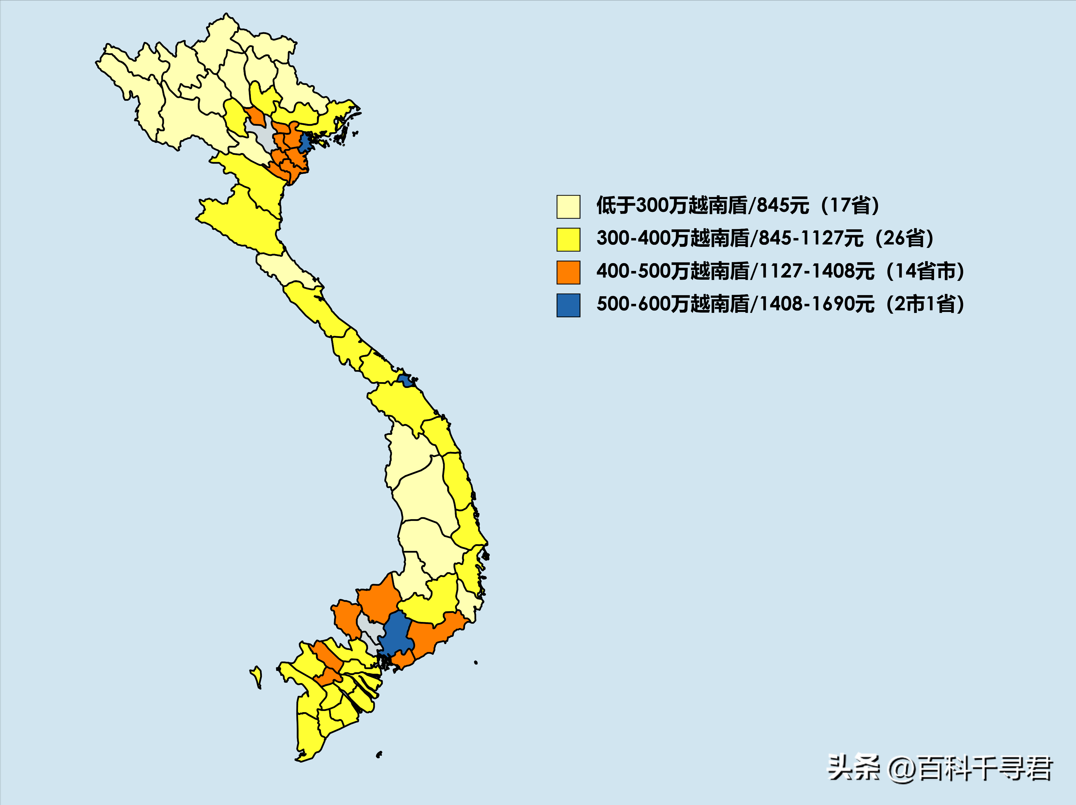 有26個省人均月收入在300萬-400萬越南盾,集中在越南中部和南部,多爲沿海省份。