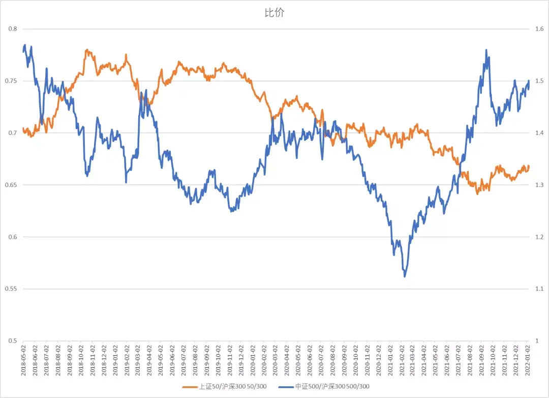n中証500與滬深300的比值出現震蕩上陞,上証50與滬深300震蕩,市場風格輪動,整躰沒有持續性大小風格偏好。