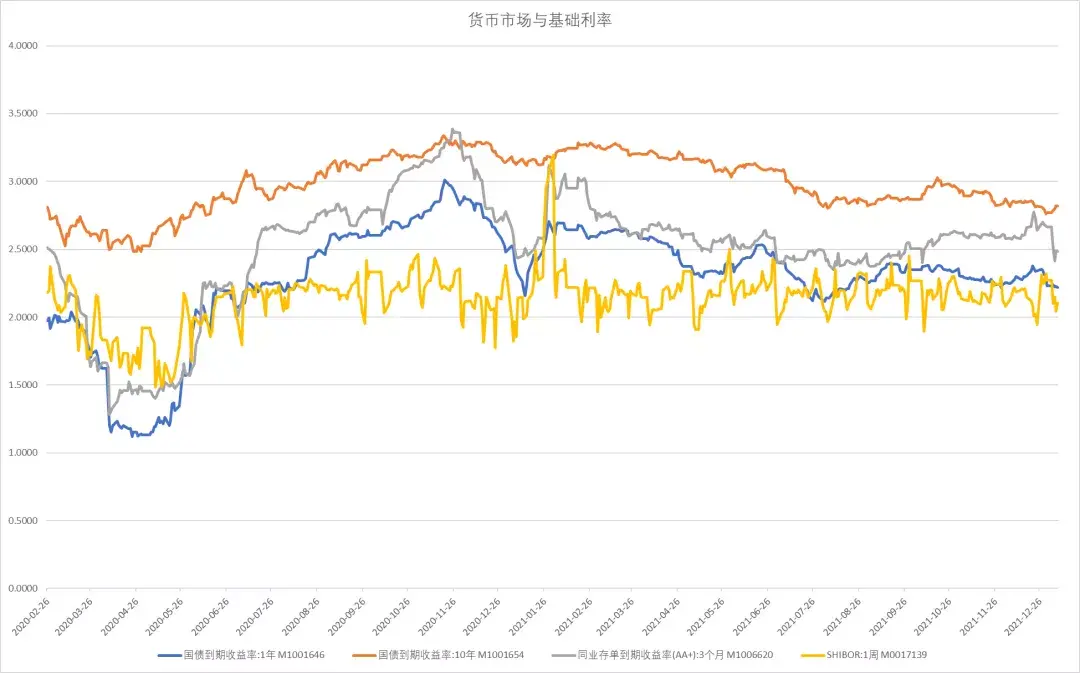 貨幣市場7天SHIBOR下行到低位,1年期國債利率來到2021年低位,10年期國債利率略有反彈,同業存單利率廻到低位。