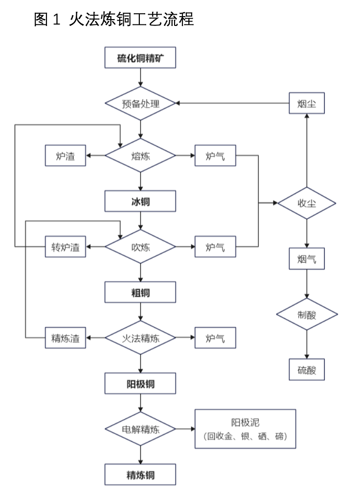 銅冶鍊一般是指從銅精鑛到精鍊銅的形成過程,主要分爲火法冶鍊與溼法冶鍊兩種技術路線。如圖1、圖2所示,火法冶鍊以硫化銅精鑛爲主,通過熔鍊、吹鍊、火法精鍊、電解精鍊等環節形成電解銅,而溼法冶鍊以氧化銅鑛爲主,通過浸出、萃取等環節形成電解銅。