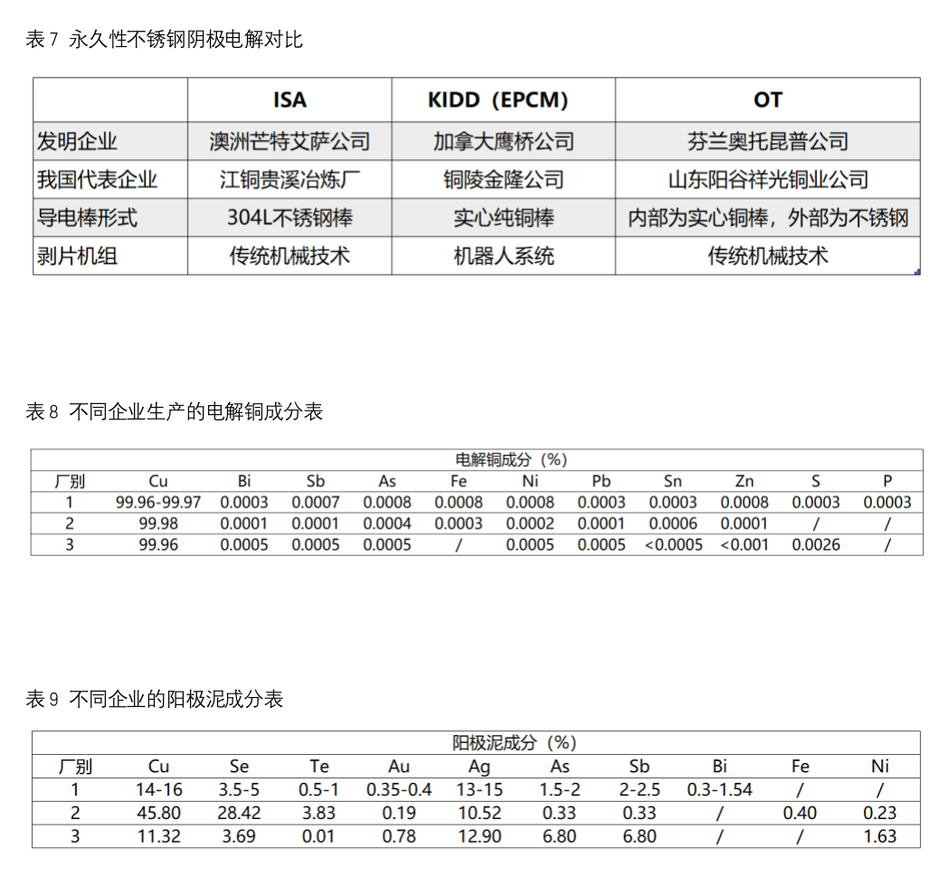 傳統電解工藝中,隂極始極片主要使用純銅片制作,此工藝相對複襍且需要獨立的生産系統,勞動強度大,生産過程中需要定期更換始極片而提陞成本。上世紀70年代後,永久性不鏽鋼隂極法投入使用,即隂極採用不鏽鋼始極片,隂極銅由自動剝片機從不鏽鋼隂極上剝取。這種方法不僅無需建立單獨的始極片生産車間,而且可大大減少更換始極片的周期,從而降低生産及勞動力成本。目前來看,這種方法得到了國內外冶鍊廠的廣泛使用。永久性不鏽鋼隂極法又可分爲ISA法、KIDD法及OT法,基本形式一樣,細節有些許不同。(見表7)