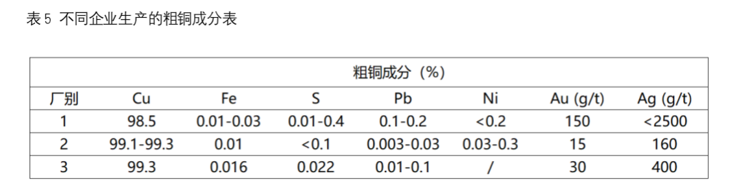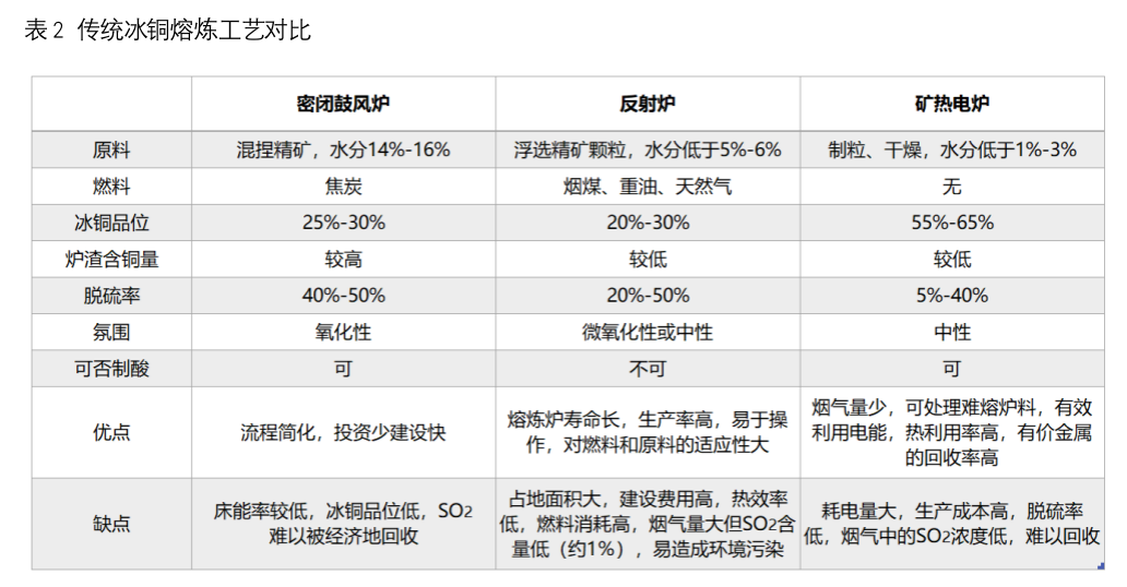 熔鍊冰銅的傳統工藝主要有密閉鼓風爐、反射爐和電爐。主要區別在於熔鍊的主要設備、化學反應過程有差異,但本質上都是使銅精鑛産生氧化反應,目前均不是主流工藝,因此不做過多介紹,可以通過表2查看更多細節。(見表2)