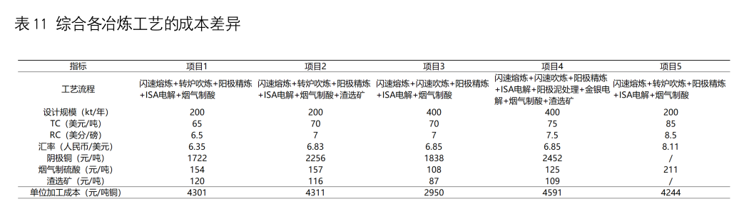 綜郃上述的五類成本及前文所述的冶鍊工藝,我們基於《銅冶鍊成本計算需關注的問題》一文中的數據,對比不同冶鍊工藝下的成本差異。