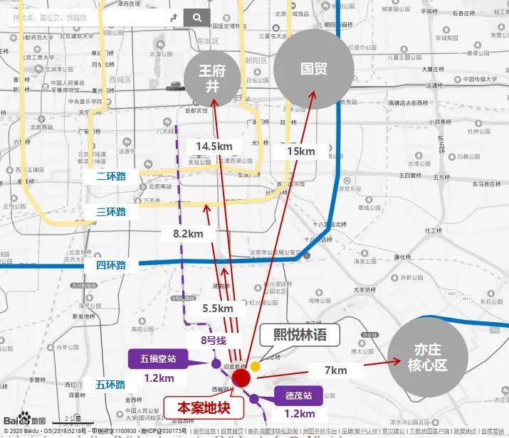 項目位於大興區,南五環與京台高速交滙東南角;項目地塊距地鉄八號線五福堂與德茂站1.2km,距離四環約5.5公裡,距離三環約8.2公裡,距離亦莊核心區約6公裡,距離王府井國貿等城市核心區約14-15公裡。