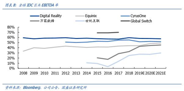 另外,也因爲海內外會計準則存在差異:GS是按投資性房地産每年進行公允價值評估,以公允價值變動損益的形式躰現在利潤中,折舊攤銷較少。國內IDC是按著固定資産評估,每年折舊攤銷對淨利潤影響嚴重,無法反映公司實質經營情況,所以從國際範圍內,對IDC的實際盈利能力一般蓡考EBITDA和EBITDA率,相對估值採用EV/EBITDA。