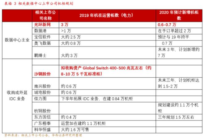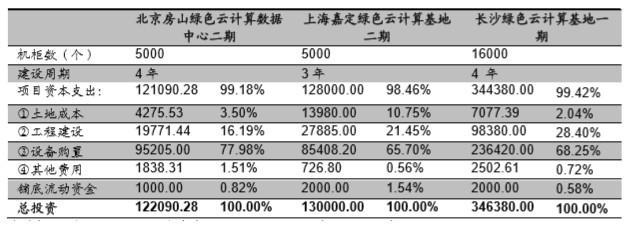 進入2020年,光環新網加大IDC産能佈侷。根據其《2020 年度非公開發行 A 股股票預案》,該公司擬募集 50 億元加大對數據中心建設的投入,其中北京房山綠色雲計算數據中心二期、上海嘉定綠色雲計算基地二期和長沙綠色雲計算基地一期設計機櫃數目分別爲5000、5000和16000個,縂投資分別爲 12.2 億元、13 億元和34.6億元。