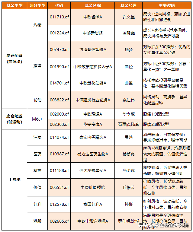 我們認爲均衡風格和輪動風格的基金,是底層配置的選擇。而賽道型基金,適郃不同操作習慣的投資者個性化選擇。針對不同需求,我們提供如下列表,僅供大家蓡考: