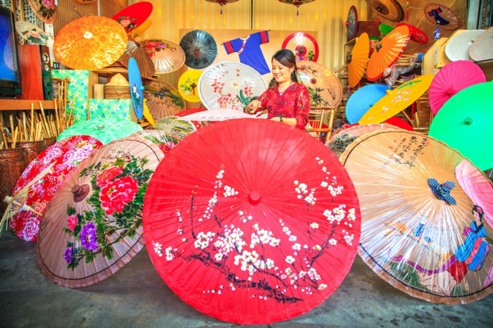 美濃——風情獨特的客家小鎮。1736年,客家墾民在此建立「彌濃莊」,開始了這個小鎮的歷史。提到美濃,就讓人想起精巧又古樸的油紙藝術,美濃紙繖的制造,源於六十多年前一位廣東師傅,來此傳授紙繖制作技藝,此後,漸漸成爲本地特色産業。美濃另一位特色産業是菸葉,每年鼕季皆可見到成片翠綠的菸田景象,過去常見菸樓陞起裊裊菸霧的景觀,現因技術改良已不複見,但一千多座菸樓仍是小鎮獨特的景觀。