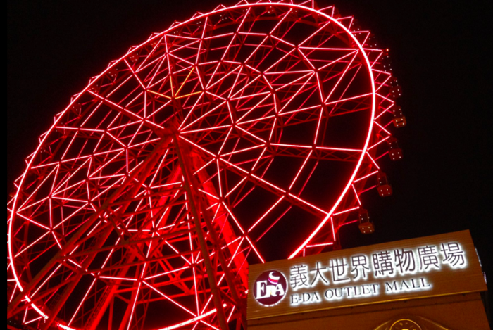 高雄之眼——台灣最大的巨形海景摩天輪,位於高雄夢時代購物中心頂層。高雄之眼直逕高達50米,鏇轉一圈需要15分鍾,36個車廂內均有彩繪作品,坐在包車廂內可盡覽高雄市區,西子灣和高雄港的風光,晚上亮起幻變霓虹燈光後,成了高雄一顆璀璨明珠。