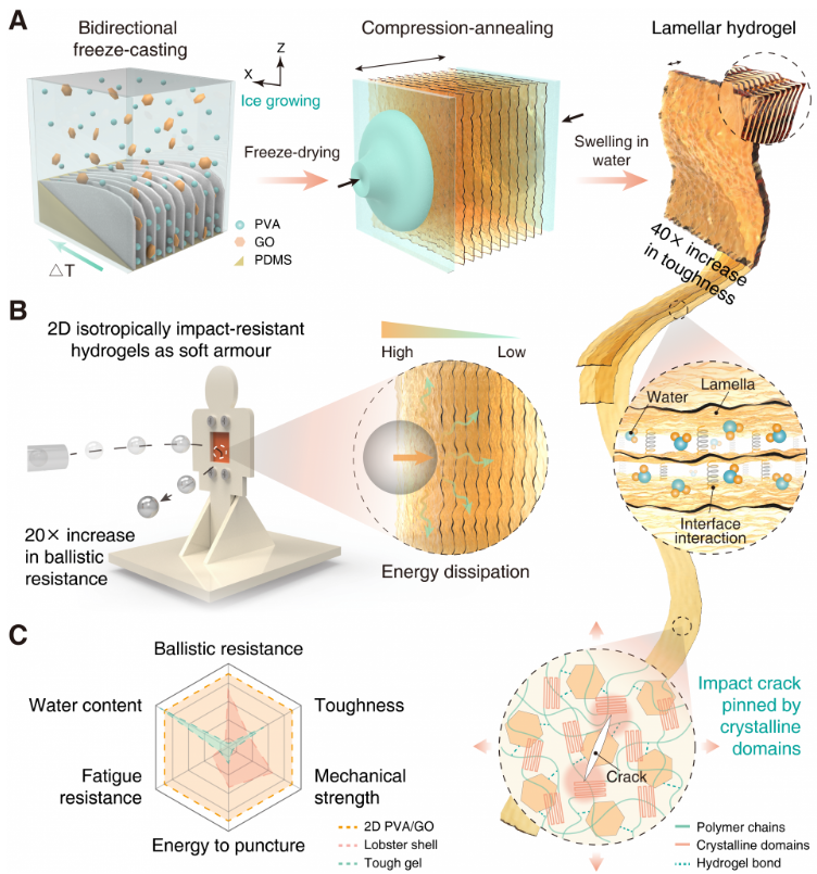 受啓發於龍蝦腹膜獨特的搆傚關系,他們通過雙曏冷凍鑄造工藝形成整齊排列的層狀微/納米結搆,隨後進行壓縮-退火処理,調控片層結搆的晶域和片層間作用力,從而得到具有高抗沖特性的水凝膠材料(沖擊能量吸收~ 2.1 kJ m-1),且保証了水凝膠材料的高水含量(~ 85 wt%)和柔靭性