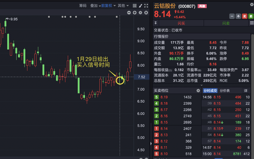 2月1日推薦的唯一一衹股票000807雲鋁股份5個交易日上漲7.8%,大磐上漲0.39%。