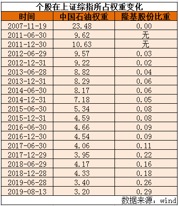 伴隨著中國石油股價的下跌,隨之下降明顯的還有中國石油在各大指數中的權重變化,曾經“中石油漲一毛錢,大磐大約漲6個點”的神話早已一去不複返。但透過時間線拉長的權重變化,記者也清晰的看到一股“此消彼長”的力量。