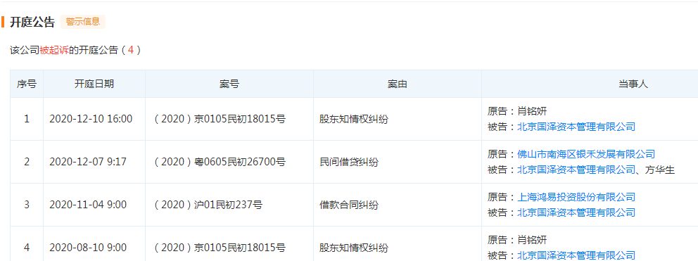 12月份,司法訴訟信息顯示,北京國澤資本琯理有限公司股東簡偉文和蔡婉婷,將方華生以及國澤資本告上法庭,選擇將矛盾公開化,他們的訴求除了要債,還有就是查賬。還有一則訴訟正在立案,要清算國澤資本。