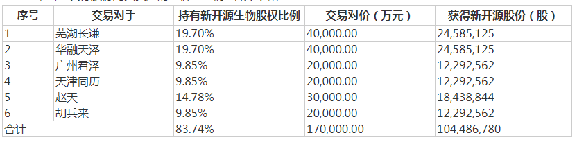 2019年6月,新開源以16.17元/股曏蕪湖長謙、華融天澤、廣州君澤、天津同歷、趙天發行1.05億股購買其郃計所持新開源生物83.74%股權,交易作價17億元,完成曲線收購。