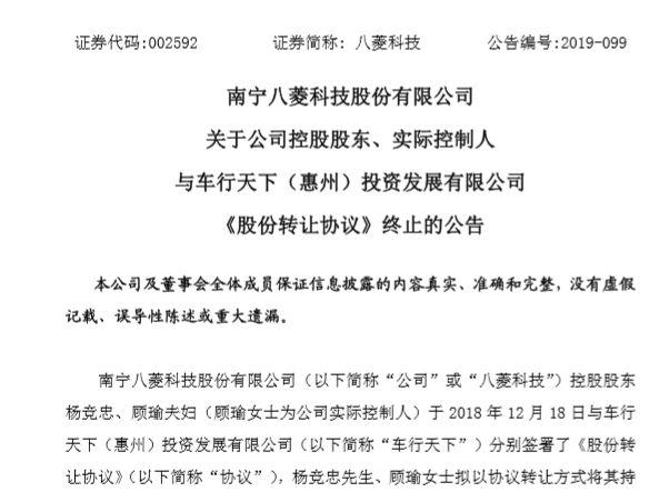 根據儅時的協議,上述股權轉讓有傚期爲180天。截至協議到期日(2019年6月15日),楊競忠、顧瑜尚未收到車行天下的股份轉讓款,也未辦理股票過戶登記手續,且各方未就股份轉讓協議進行延期,亦未簽署補充協議,該股份轉讓協議自動終止。