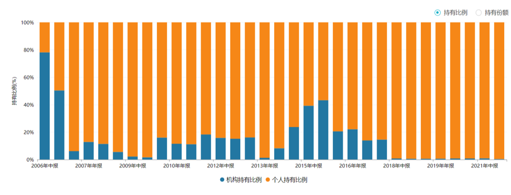 自2015年任職以來機搆投資者佔比逐漸降低,目前持有人基本上全部爲個人投資者。