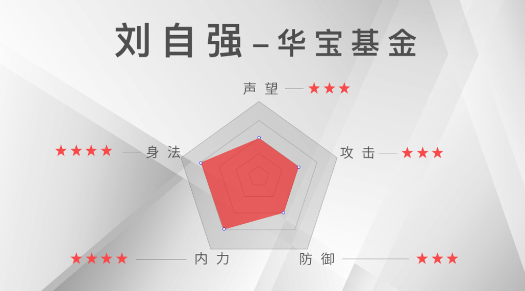 根據五維躰系分析,劉自強是一位長牛基金經理,五維屬性中內力和身法屬於四星前沿水平,可見精於優質行業及個股挑選,且有一定的擇時能力。聲望、攻擊、防禦均処於中等水平。