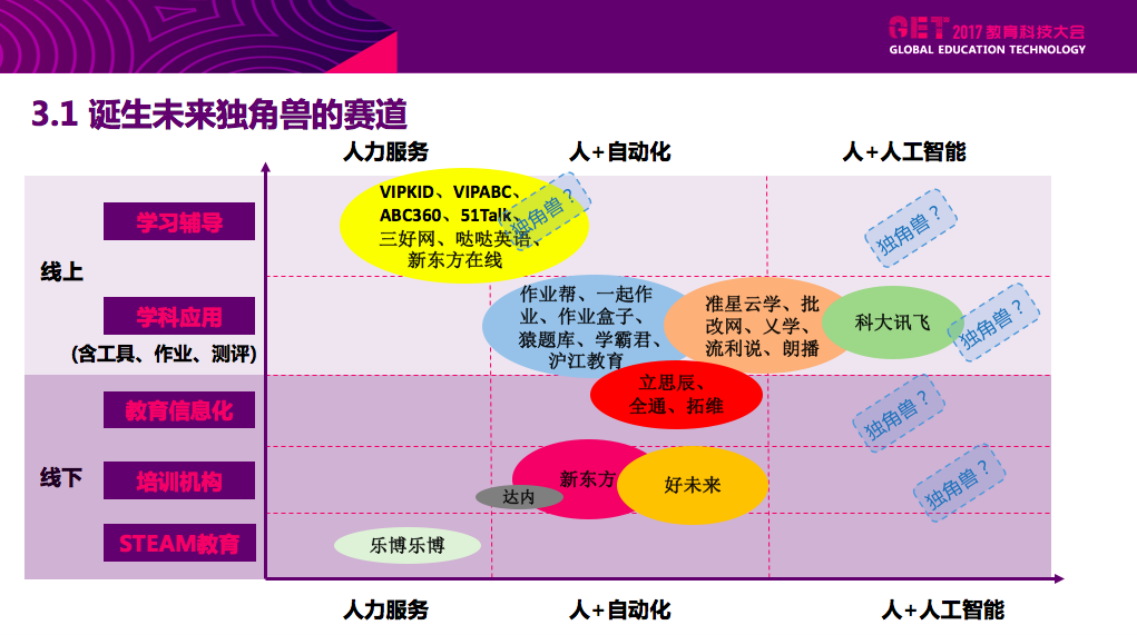 縱軸是從線下到線上,橫軸是從人的服務到最後人+人工智能的服務。如果未來能夠全是人工智能來服務的話,那我們的老師就要下崗了。那麽在這樣一個動態的環境下,我們知道線下的機搆,人力服務的機搆也在跟科技融郃,跟互聯網融郃,同時線上誕生了大量互聯網提供服務的諮詢,包括學科服務的公司,包括工具類的應用。