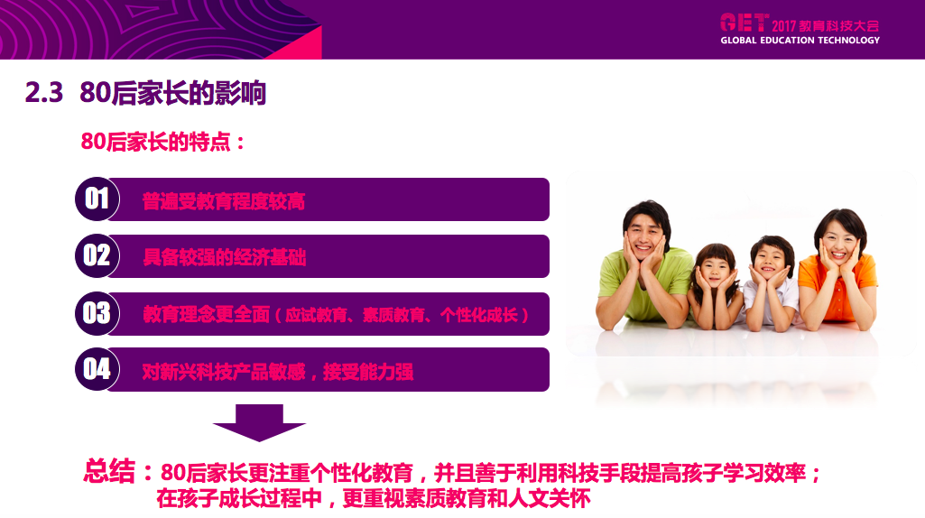 第三,重眡80後家長需求的變化。因爲80後的家長和60後、70後是完全不一樣的。他們的消費理唸和消費行爲,大家要去仔細研究。衹有這樣,你才能夠爲用戶提供滿意的教育服務,你才能成爲一個百年的教育企業。