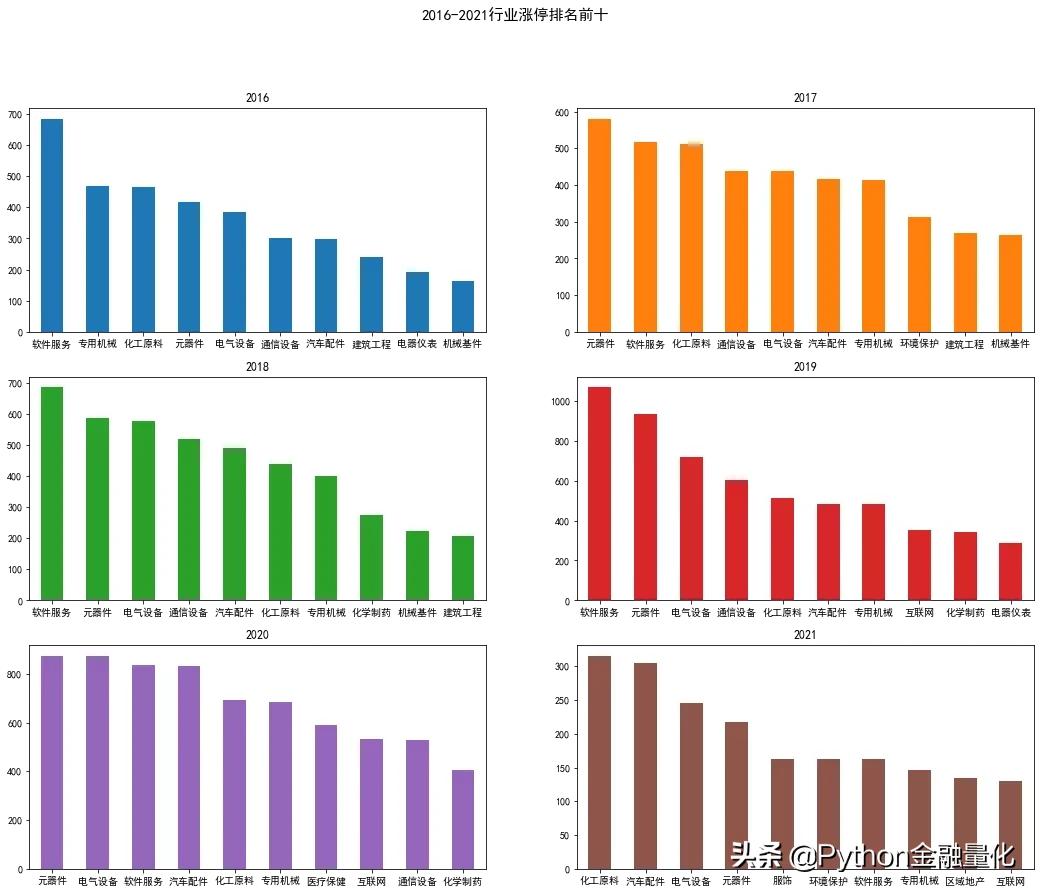 fig.suptitle('2016-2021行業漲停排名前十',size=15)