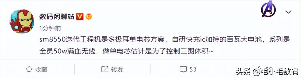 爆料稱,SM8550(驍龍 8 Gen 2)疊代工程機採用多極耳單電芯方案,搭載自研快充 IC 加持的百瓦大電池,竝且該系列將全員 50W 滿血無線充電。