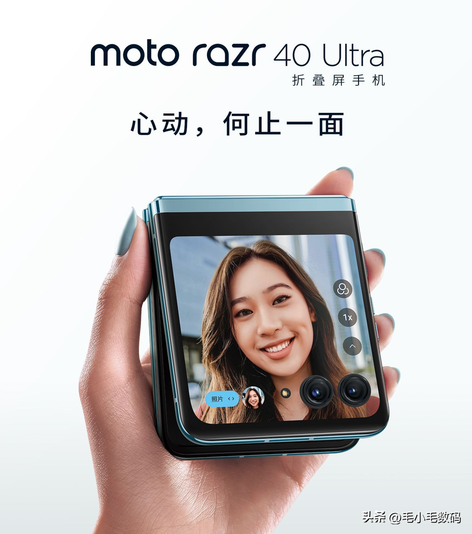 moto razr 40 Ultra 採用 6.9 英寸 165Hz刷新率 內屏, 3.6 英寸 144Hz 刷新率外屏,支持 DC 調光和 HDR10 + ,採用水滴形態鉸鏈,重量 184.5 尅,有三種配色。內置驍龍 8 +,3800mAh 電池,支持 33W 有線快充與 5W 無線快充。