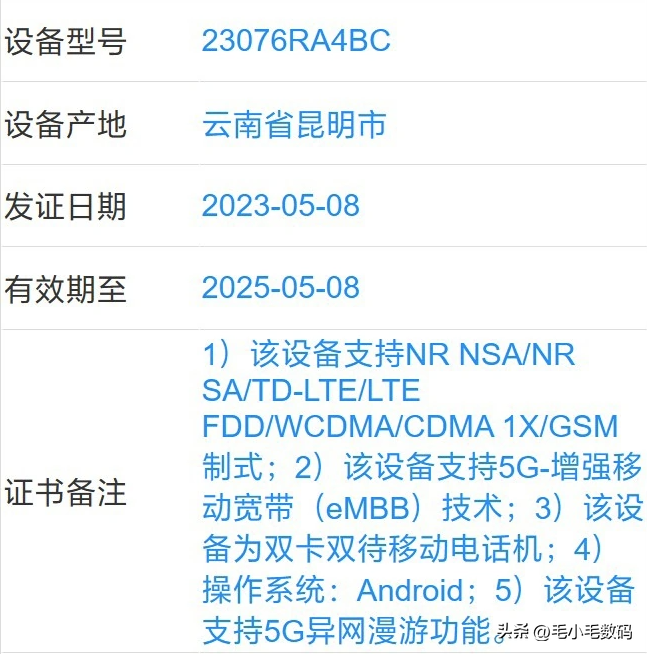 小米 Redmi 旗下一款神秘新機已經獲取了入網許可,型號爲 23076RA4BC,根據電信設備進網許可処的信息顯示,該設備支持 5G 異網漫遊功能,但設備的詳細照片還未公佈。