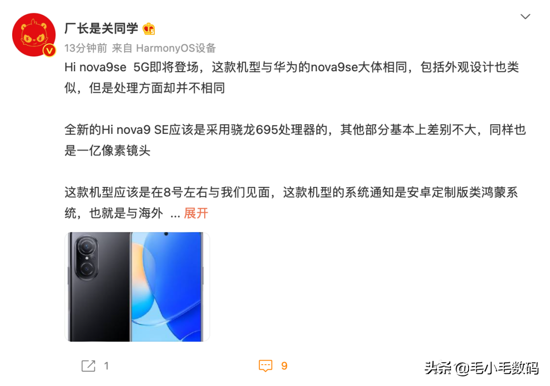 據爆料博主“廠長是關同學”消息,中郵 Hi nova9 SE 5G 將在本月 8 日發佈,外形與華爲 nova9 SE 大躰相同,処理器採用了驍龍 695,支持 5G。