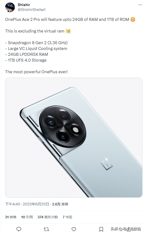 根據 @ShishirShelke1 最新爆料,即將發佈的一加 Ace 2 Pro 將搭載 3.36 GHz 的高通驍龍 8 Gen 2、24GB LPDDR5X RAM、1TB UFS 4.0 存儲,影像系統與 11R 相同,還將配備大麪積 VC 液冷散熱片。