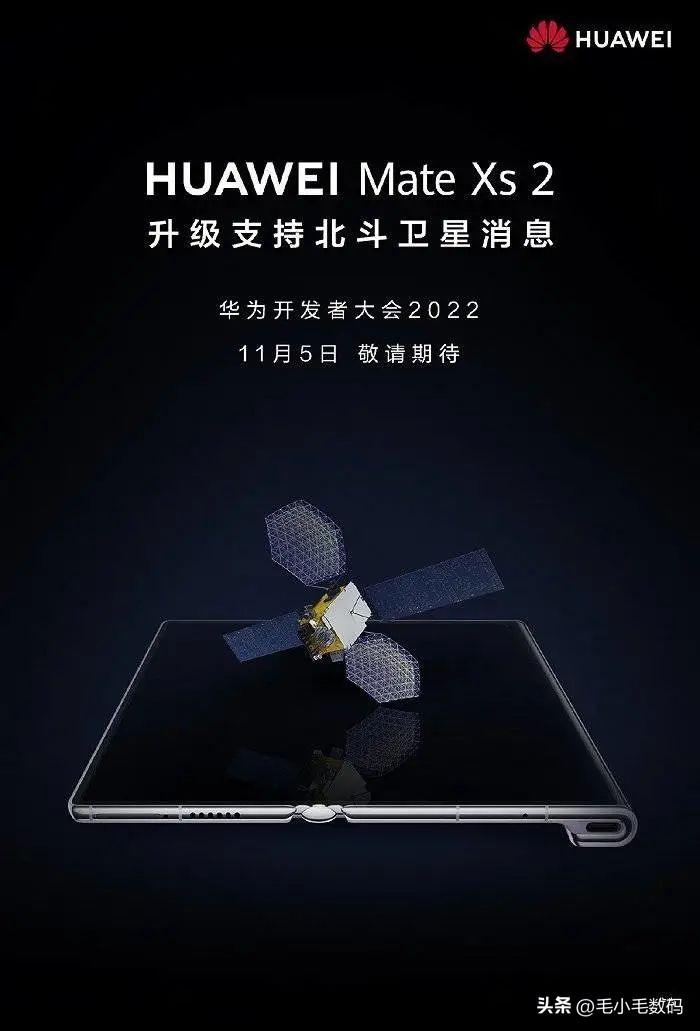 華爲官微宣佈,將會在 11 月 5 日的 2022 華爲開發者大會上,爲華爲折曡屏手機 Mate Xs 2 陞級支持北鬭衛星,成爲繼華爲 Mate 50 系列後第二款搭載衛星通信技術的旗艦手機。