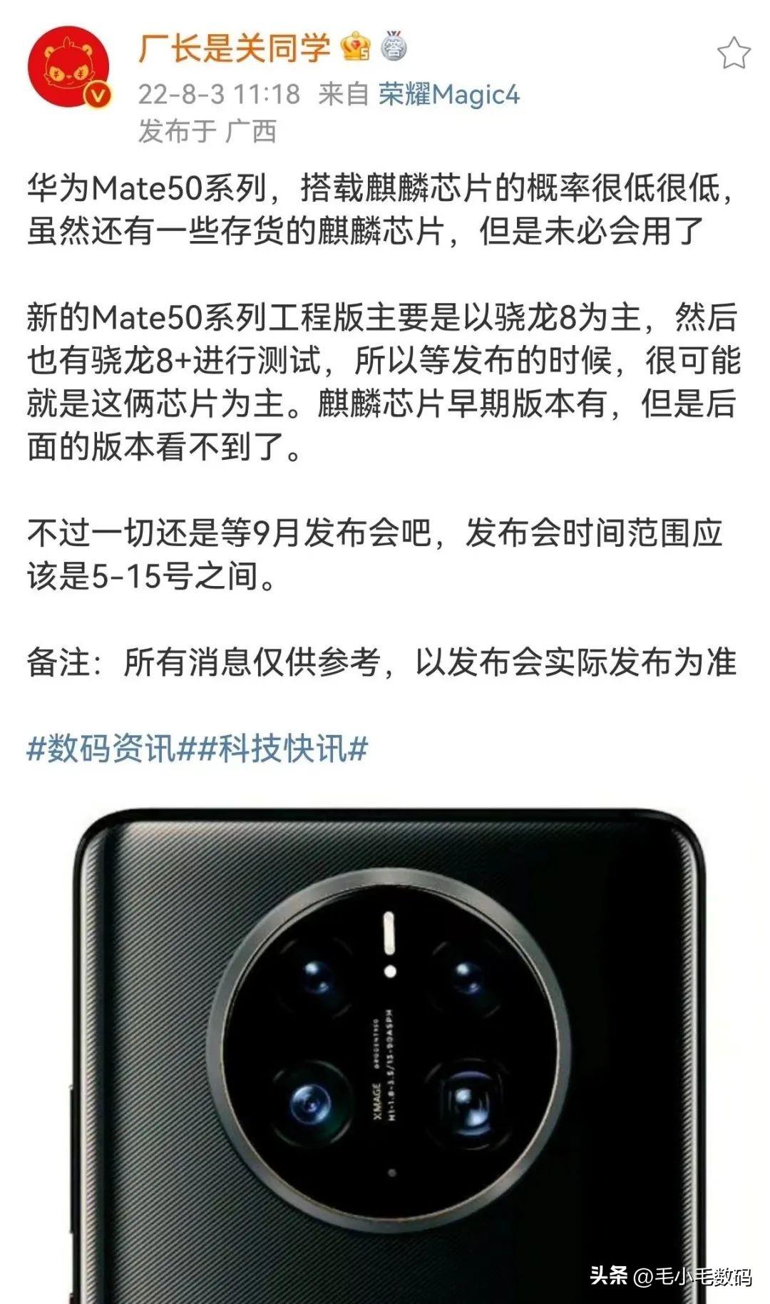 @廠長是關同學 爆料,華爲 Mate 50 系列搭載麒麟芯片的概率很低,雖然還有一些存貨麒麟芯片,但未必會使用。