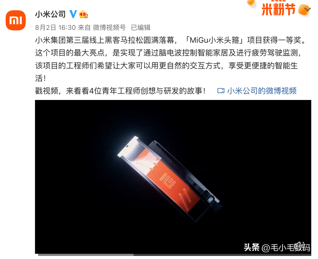 小米近日發佈消息表示,“小米集團第三屆線上黑客馬拉松圓滿落幕,「MiGu小米頭箍」項目獲得一等獎。這個項目的最大亮點,是實現了通過腦電波控制智能家居及進行疲勞駕駛監測,該項目的工程師們希望讓大家可以用更自然的交互方式,享受更便捷的智能生活!”
