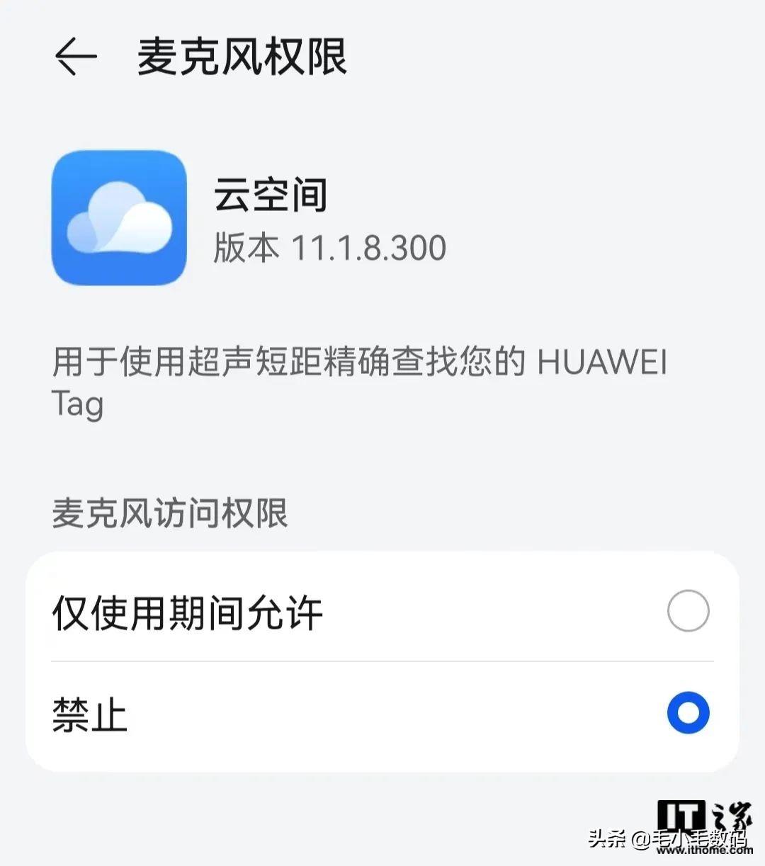 有網友發現了華爲也將推出類似産品,目前“HUAWEI Tag”已經出現在了雲空間 App 相關權限設置界麪的介紹中。據悉,HUAWEI Tag 除了常槼的藍牙外似乎還支持超聲短距精確查找,目前尚不清楚華爲將在何時推出這一産品。