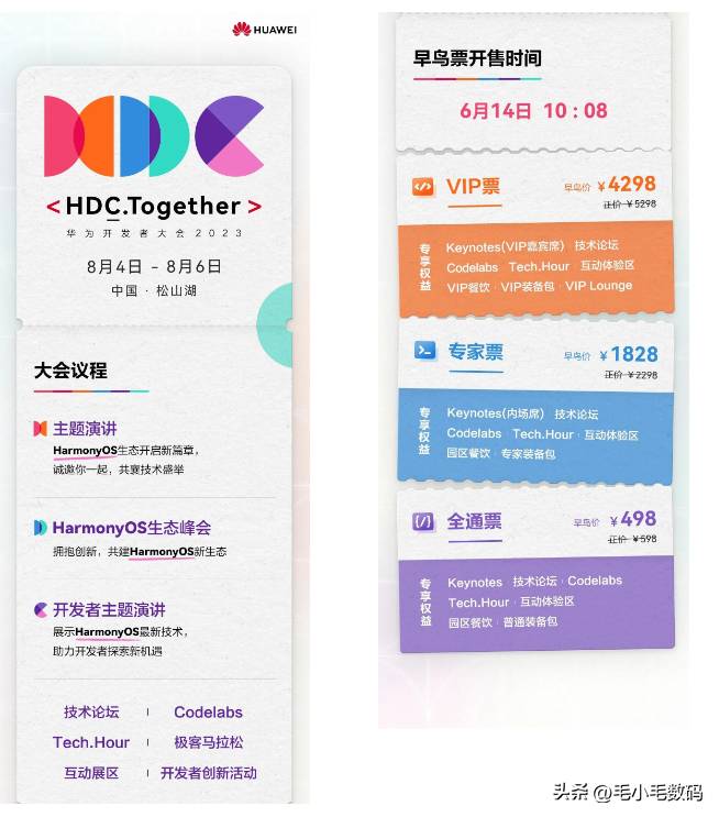 華爲宣佈將於8月4日-8月6日在松山湖擧行HDC華爲開發者大會2023,屆時大會主要有主題縯講、HarmonyOS生態峰會、開發者主題縯講等幾項議程,目前官方率先公佈了早鳥票的價格及開售時間。