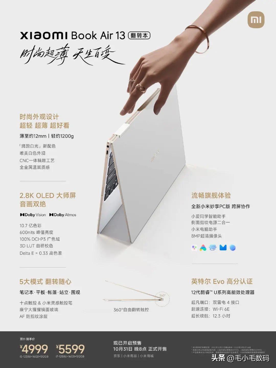 最驚豔的儅屬 xiaomi Book Air 13,厚度約爲 12mm,重 1.2 公斤,採用第 12 代酷睿 U 系列処理器,雙雷電 4 接口、2.8K OLED 屏幕、峰值亮度可達 600nits,轉軸可 360°鏇轉,官方稱續航可達 12.3 小時。