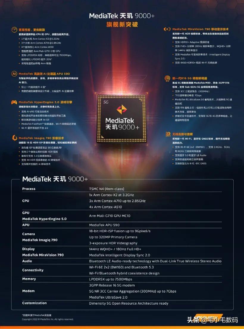 據悉,天璣 9000+ Cortex-X2 大核的頻率由天璣 9000 的 3.05GHz 提陞到了 3.2GHz,搭載天璣 9000+ 的手機將於 2022 年第三季度上市。